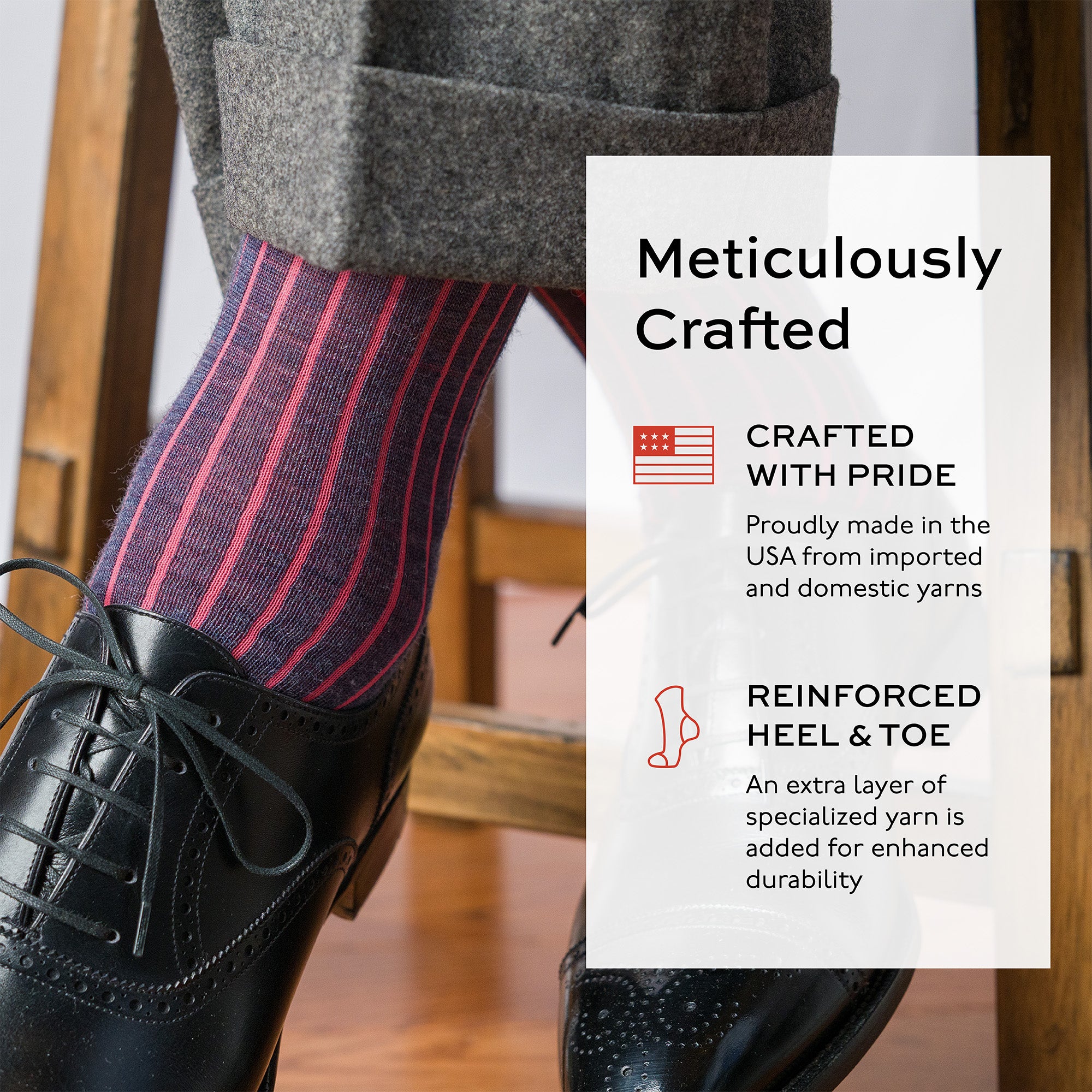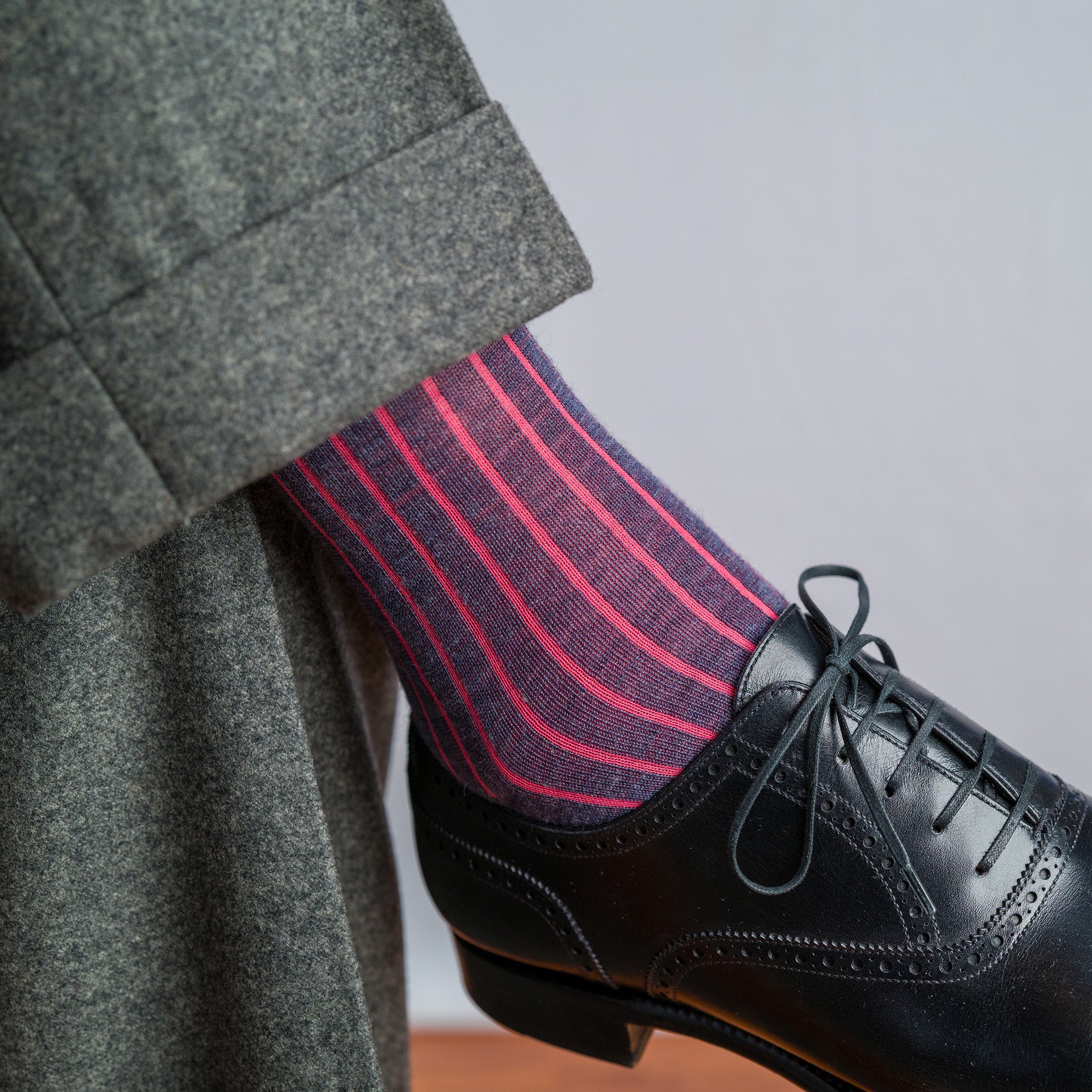 Denim heather merino wool is accented with coral ribbing for a tasteful color combination. These shadow stripe socks are easy to dress up with a suit or wear casually with chinos or jeans.